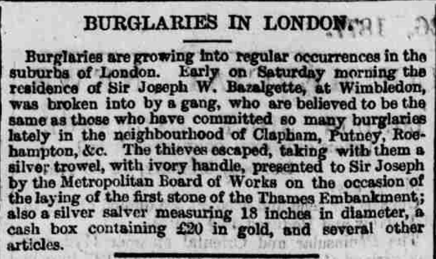 The burglars took an odd selection of booty, including a silver trowel with an ivory handle bearing the inscription “Presented by the Metropolitan Board of Works to J.W. Bazalgette Esq in commemoration of the laying of the first stone of the Thames Embankment.” This was said to be highly valued by Sir Joseph; and, one would have thought, far too distinctive to find an illicit buyer. They also carried off a large salver, a silver ink-stand, an overcoat, four photographs, and a japanned cash box containing about £20 (worth about £2000 now.) Was it widely known in the neighbourhood that large sums of cash were held in the house? Was it an inside job? The cash box was in a secretaire with 18 or 20 drawers: and apparently only the one containing the cash box had been opened. The robbers were not traced. (Surrey Advertiser 1.12.1877)