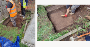 We started the day by digging the first trial pit to the left of the stairs. All the works were completed with hand tools to minimise disruption in the churchyard.